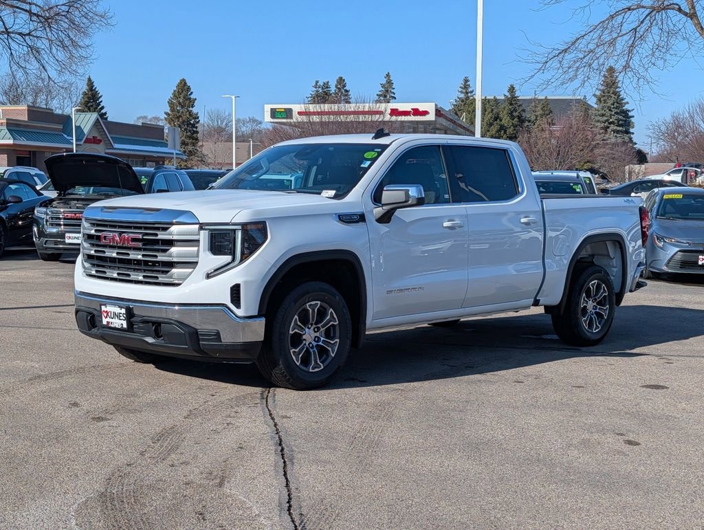 Experience the exceptional power and versatility of the 2026 GMC Sierra 1500 SLE. This remarkable truck is a true workhorse, built to handle even the toughest tasks with ease.Boasting a robust EcoTec3 5.3L V8 engine, the Sierra 1500 SLE delivers an impressive 355 horsepower and 383 lb-ft of torque, ensuring you have the muscle to conquer any challenge. Paired with a smooth-shifting 10-speed automatic transmission and 4-wheel drive, this truck is ready to tackle any terrain with confidence.- 5.3L V8 (EcoTec3) engine with Dynamic Fuel Management- 18 x 8.5 6-spoke machined aluminum wheels with Dark Grey Metallic accents- Navigation System- Preferred Equipment Group 3SA- Remote Start Package- SLE Convenience Package- SLE Value Package- Standard Suspension Package- Trailering PackageStep inside the Sierra 1500 SLE and experience the perfect blend of comfort and technology. The dual-zone automatic climate control ensures you and your passengers stay comfortable, while the premium GMC Infotainment Audio System with SiriusXM keeps you entertained on every journey. The power driver's seat and heated front seats add an extra touch of luxury, while the 120-volt bed-mounted power outlet and 120-volt interior power outlet provide the convenience you need.Safety is a top priority in the Sierra 1500 SLE, with features like Automatic Emergency Braking, Forward Collision Alert, Lane Keep Assist with Lane Departure Warning, and the HD Rear Vision Camera to help you navigate with confidence.Whether you're hauling heavy loads, towing a trailer, or simply enjoying the open road, the 2026 GMC Sierra 1500 SLE is the perfect companion. With an EPA-estimated 15 city/18 highway MPG, this truck delivers impressive efficiency without compromising power.Experience the unparalleled capability and refined comfort of the 2026 GMC Sierra 1500 SLE. Schedule a test drive today and discover why this truck is the perfect choice for your next adventure.Kunes treats the needs of each individual customer with paramount concern. We know that you have high expectations, and as a car dealer we enjoy the challenge of meeting and exceeding those standards every time. Allow us to demonstrate our commitment to excellence! Our experienced sales staff are eager to share their knowledge and enthusiasm with you. We encourage you to browse our online inventory, schedule a test drive and investigate financing options. These prices are subject to change. Prices shown do not include taxes, license, and title fees and a $350 documentary service fee. Price includes: $1500 - Buick GMC Bonus Cash. Exp. 04/30/2026 $1750 - Buick & GMC Consumer Cash Program. Exp. 04/30/2026 $3000 - GM Trade In Allowance Program. Exp. 04/30/2026